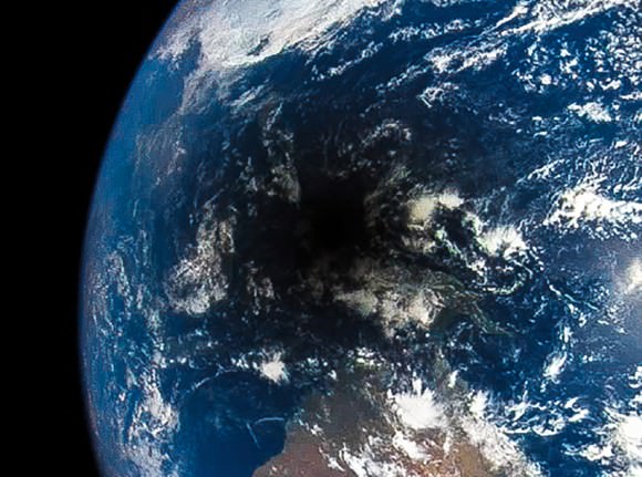 , the view from space looking back at Earth showed the Moon's dark shadow passing over islands, clouds, and sea.