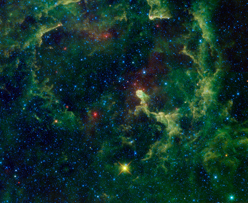 The stellar wind, that is! This beautiful image, taken by NASA's Wide-Field Infrared Explorer (WISE) shows a vast ring of interstellar dust and gas being forced outwards by the wind and radiation from a massive star.