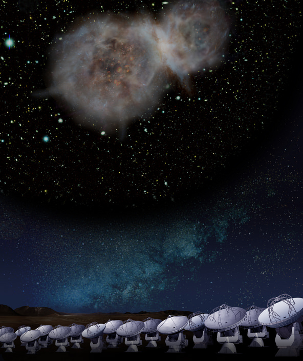 Lead image caption: Artist impression of the submillimeter galaxy LESS J0332 observed the ALMA at the 5000-meter altitude plateau. [Credit: NAOJ]