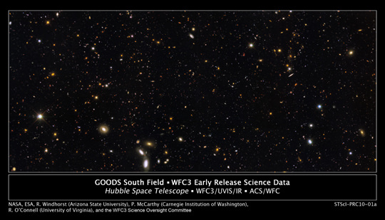 The image above is a newly released image from the Hubble Space Telescope. The image shows a mosaic of a portion of the Great Observatories Origins Deep Survey (GOODS) South Field nearly 1/3 the size of the full moon taken in September and October of 2009. It combines data taken in 10 filters that span the infrared to near ultraviolet. It made use of the newly installed Wide Field Camera 3 (WCF3) and the Advanced Camera for Surveys (ACS). The survey used 100 Hubble orbits for images from the ACS and 104 for the WCF3 images. Galaxies in the image are as faint as 26.5th to 27th magnitude which is several thousand times fainter than can be viewed with the naked eye and shows 7,500 galaxies.