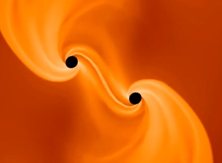 These fragments would orbit the center of the star and become increasingly dense as they picked up matter during the collapse; they would also increase in temperature. And then, Reisswig says, "an interesting effect kicks in." At sufficiently high temperatures, there would be enough energy available to match up electrons and their antiparticles, or positrons, into what are known as electron-positron pairs. The creation of electron-positron pairs would cause a loss of pressure, further accelerating the collapse; as a result, the two orbiting fragments would ultimately become so dense that a black hole could form at each clump. The pair of black holes might then spiral around one another before merging to become one large black hole.