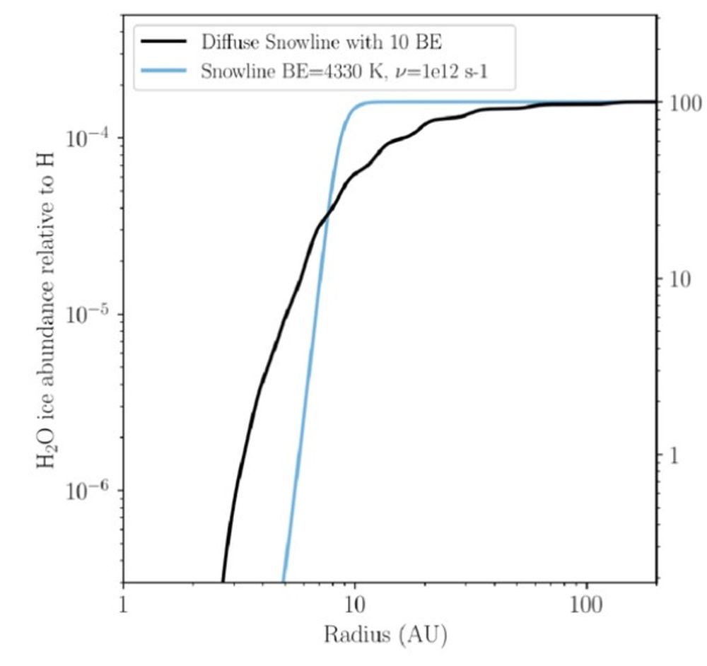 "While the classically used snowline relies on a single condensation temperature, recent work in quantum chemistry shows that the binding energy (BE) of water on icy grains has a Gaussian distribution, which implies a gradual sublimation of water rather than a sharp transition," the authors write. The researchers computed the distribution of binding energies to understand how water ice on dust grains was spread across the proto-solar nebula (PSN) protoplanetary disk.