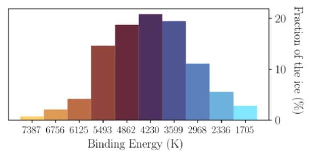 But in this new understanding, the line is more nebulous. The research is based on developments in quantum chemistry showing that there's no specific single temperature at which water binds itself to dust grains. Instead of a binary dividing line, the binding energies are subject to a Gaussian distribution of values.