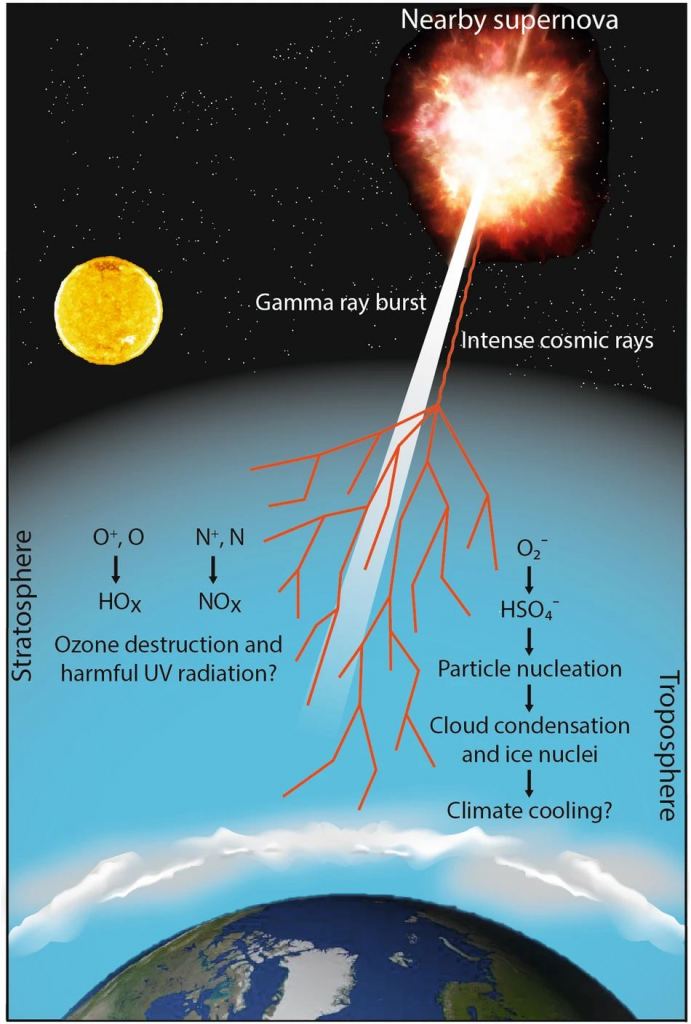 Supernovae are dangerous, and the closer a planet is to one, the more deadly its effects. Scientists have speculated on the effects that supernova explosions have had on Earth, wondering if it triggered mass extinctions or at least partial extinctions. A supernova's gamma-ray burst and cosmic rays can deplete Earth's ozone and allow ionizing UV radiation to reach the planet's surface. The effects can also create more aerosol particles in the atmosphere, increasing cloud coverage and causing global cooling.
