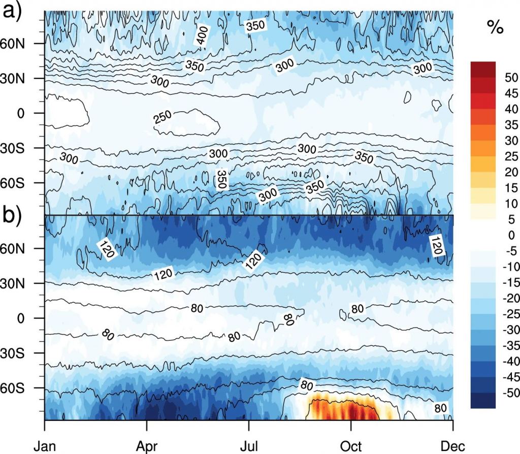 "The maximum ozone depletion over the poles is less than the present-day anthropogenic ozone hole over Antarctica, which amounts to an ozone column loss of 60–70%," the authors explain. "On the other hand, there is an increase of ozone in the troposphere, but it is well within the levels resulting from recent anthropogenic pollution."