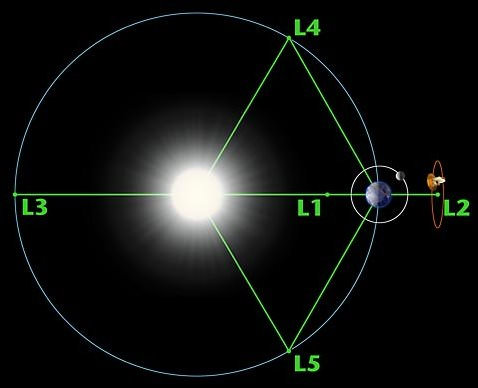 . These are the five positions in Earth's orbital configuration around the Sun where where the combined gravitational pull of the Earth and the Sun provides precisely the centripetal force required to orbit with them.