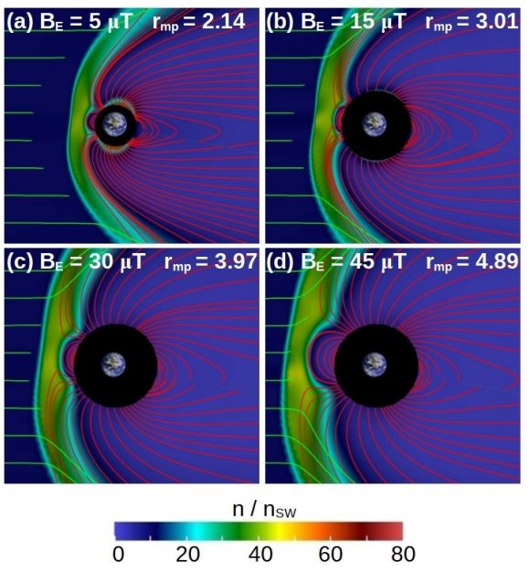 A critical part of this work is the magnetopause standoff distance. That distance is compressed by more energetic solar winds and expanded when the Earth's magnetic strength is higher. In the figure above, (a) has a much-reduced magnetopause standoff distance than (d) when the magnetic field strength is higher.