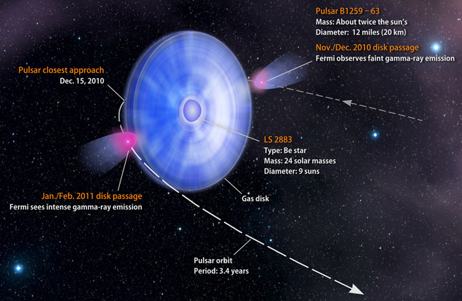 While the EGRET telescope aboard NASA's Compton Gamma-Ray Observatory had been observing this rare pair since the 1990s, no gamma-ray emission in the billion-electron-volt (GeV) energy range had ever been recorded. But, as the time of passage approached, the Large Area Telescope (LAT) aboard Fermi began to pick up faint gamma-ray emission. "During the first disk passage, which lasted from mid-November to mid-December, the LAT recorded faint yet detectable emission from the binary. We assumed that the second passage would be similar, but in mid-January 2011, as the pulsar began its second passage through the disk, we started seeing surprising flares that were many times stronger than those we saw before," Abdo said.