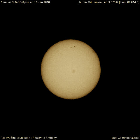 Astrophotographers capturing the recent annular solar eclipse on January 15, 2010 got an added bonus: upon closer inspection, they found sunspot 1040 also showed up on their images, too. "We didn't mean to catch sunspots in our Jaffna Eclipse expedition, nor did we plan to," said