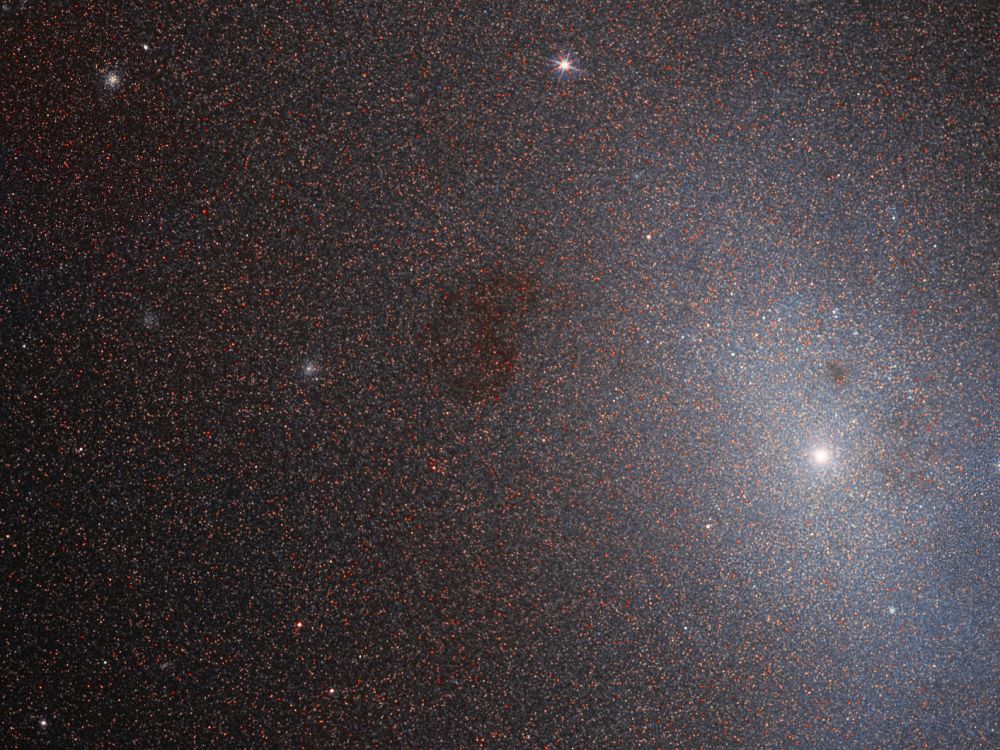 The Hubble image was taken in visible and near-infrared light with the Wide Field and Planetary Camera 2. M 110's center is near the lower right of the image, where the young blue stars are. Bright points are globular clusters contained in the galaxy, as well as individual stars. This Hubble image was part of an effort to understand globular clusters.