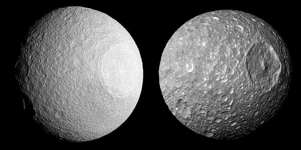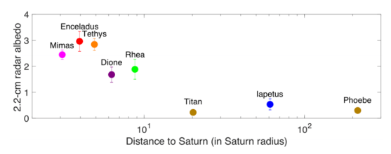 The Cassini spacecraft carried a powerful radar designed to penetrate the thick, opaque, atmosphere of Titan, Saturn's largest moon. But it was also pointed at other moons, including Mimas, Enceladus, and Tethys, in an effort to measure their albedo and characterize their surfaces.
