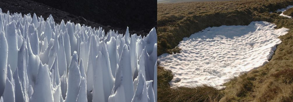 Icy land-forms can form other more exotic types of structures that could be responsible for the reflectivity. Penitentes are thin, elongated blades of snow or ice that are closely spaced together and point towards the Sun. Suncups are open depressions on a snowy surface that are also highly reflective. But they need a lot of solar energy to form, and it's not clear if they get enough.