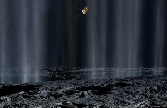 Cassini has made nine flybys of the icy, geyser-filled moon Enceladus (Saturn's sixth-largest moon) since 2005. The closest of these have taken the spacecraft's suite of instruments just 25 km from Enceladus's surface, which scientists believe conceals a saline ocean. Heated vents at the south pole of the moon release a plume of material, consisting mainly of icy grains and water vapour, into space.