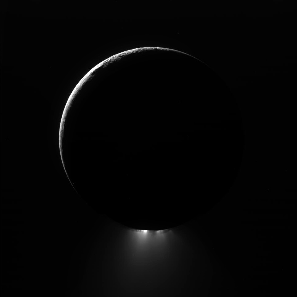 ) assembled to show Enceladus in its crescent-lit entirety with jets in full force. The images were rotated to orient the moon's southern pole -- where the jets originate -- toward the bottom.