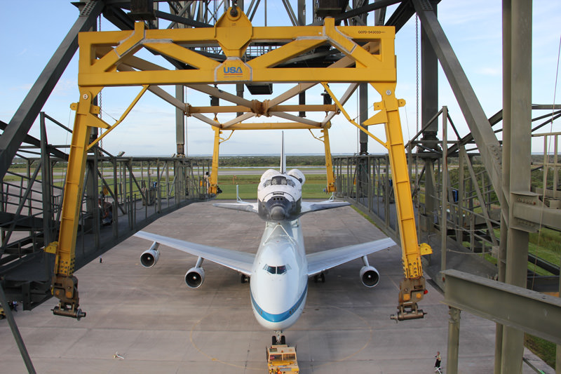 Image caption: Endeavour atop the 747 SCA exits the Mate-Demate Device at the Kennedy Space Center Shuttle Landing Facility on Sept. 17. Credit: Ken Kremer
