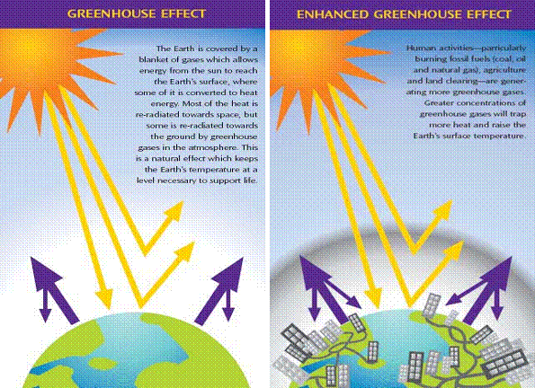Every day, solar radiation reaches the surface of our planet from the sun. It is then converted into thermal radiation which is then absorbed by atmospheric greenhouse gases (such as carbon dioxide) and is re-radiated in all directions. Known as the Greenhouse Effect, this process is essential to life as we know it. Without it, Earth's surface temperature would be significantly lower and many life forms would cease to exist. However, where human agency is involved, this effect has been shown to have a downside. Indeed, when excess amounts of greenhouse gases are put into the atmosphere, this natural warming effect is boosted to the point where it can have damaging, even disastrous consequences for life here on Earth. This process is known as the Enhanced Greenhouse Effect, where the natural process of warming caused by solar radiation and greenhouse gases is heightened by anthropogenic (i.e. human) factors.