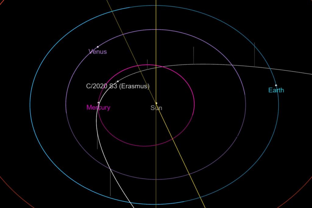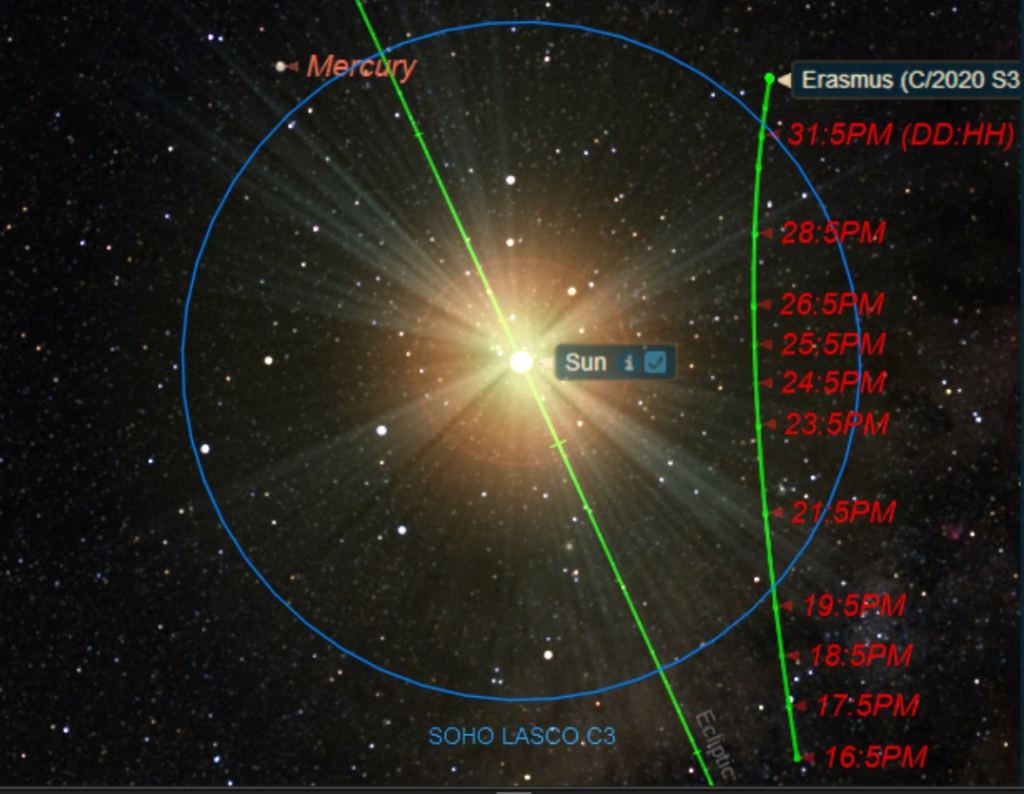 The comet reaches perihelion in mid-December, just inside the orbit of Mercury. S3 Erasmus is on an 1,800-year orbit give or take 300 years, inclined 20 degrees relative to the ecliptic plane. Like so many comets prior to the advent of the telescope, S3 Erasmus went unnoticed during its last passage through the inner solar system, two millennia ago.