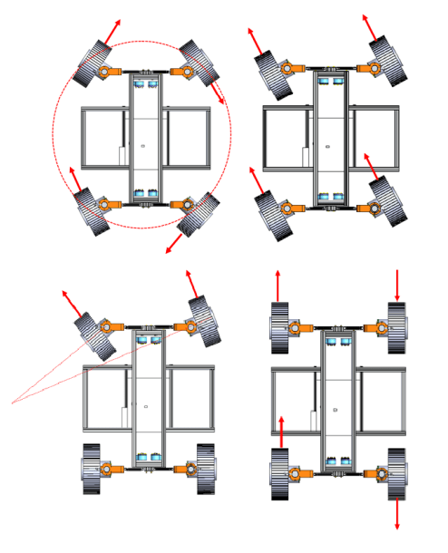 On-side steering allows for four different turning modes: Skid Steering, Ackermann Turn, Crab Turn, and Point Turn.