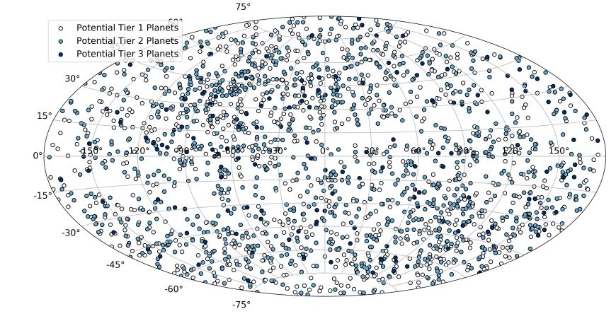 In 2022, researchers published a paper presenting a Mission Reference Sample for Ariel. It's derived from currently-known exoplanets and from the Tess Planet Candidates. The image below shows how the targets are spread across the sky.