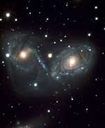 Similarly, the spiral arms of the well-known Whirlpool galaxy (Messier 51) may have been produced by a close encounter with a second galaxy that is now located at the end of one of the spiral arms; the same may be true for the beautiful southern galaxy NGC 1232 depicted in another VLT photo (PR Photo 37d/98).