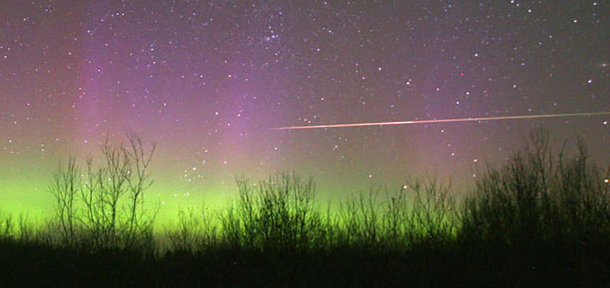 A bright, earthgrazing Eta Aquarid streaks across Perseus and through the aurora on May 6, 2013. Because the radiant is low for northern hemisphere observers, earthgrazers - long, bright meteors that come up from near the horizon and have long-lasting trails. Credit: Bob King[/caption]