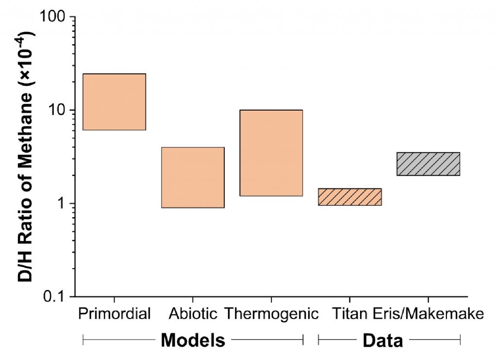 Reference: Glein, Christopher R., et al. " Moderate D/H ratios in methane ice on Eris and Makemake as evidence of hydrothermal or metamorphic processes in their interiors: Geochemical analysis." Icarus (2024): 115999.