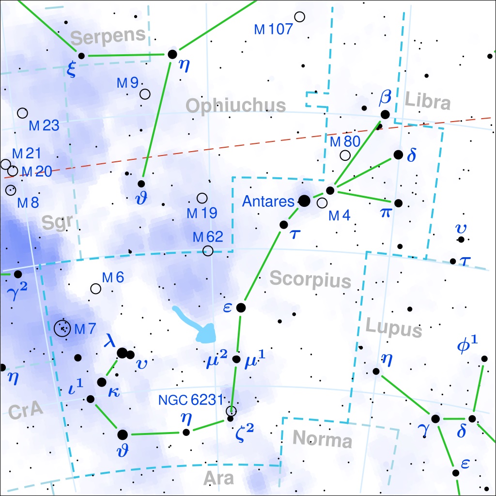 µ2 Scorpii is a naked-eye star - you can go out and look for it yourself - it forms part of the tail end of the Scorpius constellation, not far below the bright star known as Antares. µ2 Scorpii is a B-type star, nine times the Sun's mass - large enough that someday it will explode in a spectacular supernova, before collapsing into a dense neutron star.