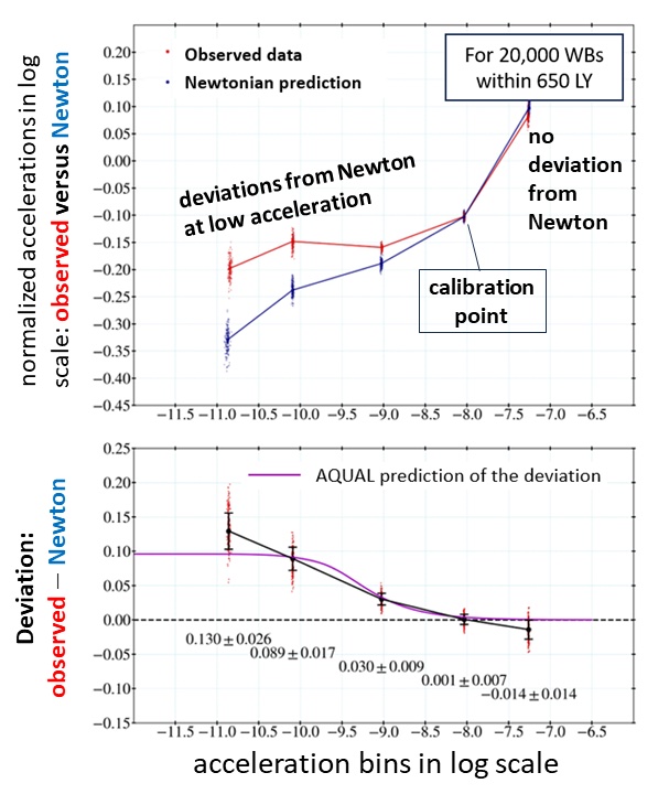Taking data from the Gaia Space Telescope, the author analyzed the orbital motion of 26,500 wide-binary systems and compared the gravitational accelerations of the stars with their orbital separations. At larger accelerations, the orbits agree with both AQUAL and Newtonian gravity, but at smaller accelerations, the binary orbits deviate from Newton exactly as AQUAL predicts. In other words, for thousands of binary systems, AQUAL is a better model of their motion than Newton. This would seem to contradict dark matter models.