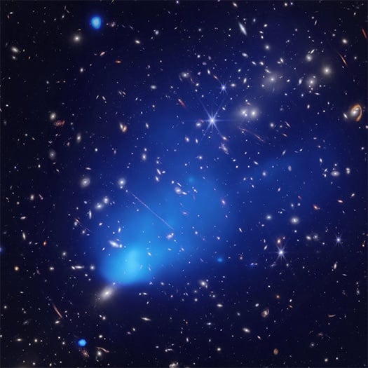X-ray images show different peak locations for the different mass components. The X-ray image below shows a single X-ray emission peak in the SE subcluster and two faint tails elongated beyond the X-ray peak. The X-ray peak precedes the dark matter peak. The Brightest Cluster Galaxy (BCG) is also offset from the SE mass centroid. BCGs are the brightest galaxies in a given cluster, are extremely massive, and are centers of mass in clusters.