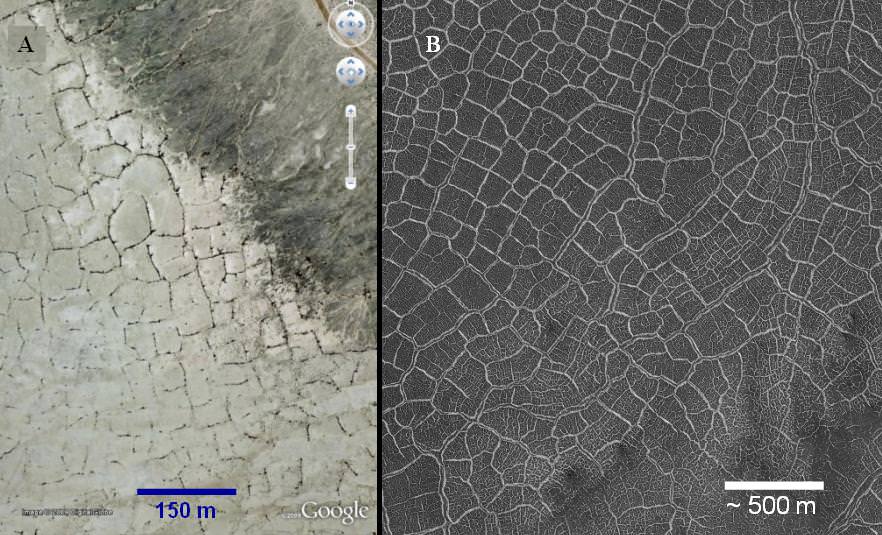 [/caption] Networks of giant polygonal troughs found in crater basins on Mars are cracks caused by evaporating lakes. These landforms had been attributed to thermal contractions in the Martian permafrost, similar to what the Phoenix lander explored near the north pole on the Red Planet. But these polygon-shaped cracks are too large to be caused by thermal contractions and provide further evidence of a warmer, wetter Martian past.