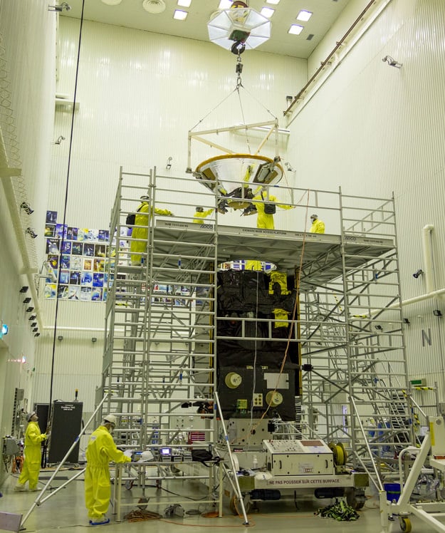 The mating operations commenced on February 12 with the hydrazine fueled lander in a mounting platform surrounding the orbiter that "facilitates the activities that need to be done about 4 meters off the ground," according to ESA officials.