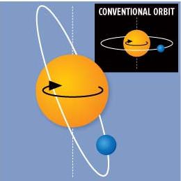 [/caption] In what might be a evidence of planetary billiards, astronomers have found an exoplanet with an extremely odd orbit. The question is, was this planet the cue ball or the object ball? While most planets orbit around a star's mid-section, this one – called XO-3b -- is tilted about 37 degrees from the star's equator. It's also a massive planet, about 10 times the size of Jupiter. Such a misalignment must have occurred as a result of a disturbance, such as a collision with another object, sometime after the planet's formation. But astronomers say they don't yet know what caused the unusual orbit of XO-3b.