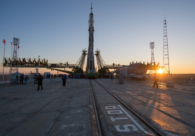 The Soyuz rocket is rolled out to the launch pad by train on Monday, December 17, 2012, at the Baikonur Cosmodrome in Kazakhstan. Credit: (NASA/Carla Cioffi).