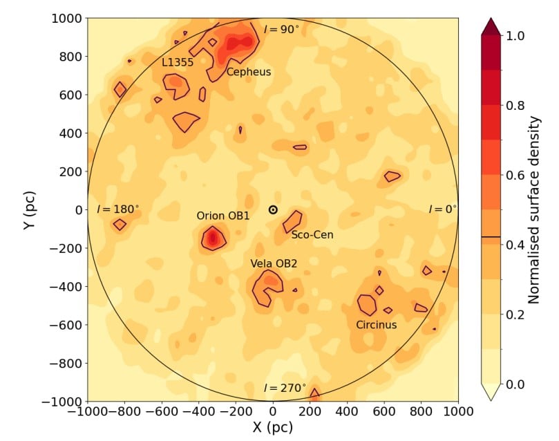 This figure from the research shows the surface density of the SED-fitted OB stars in Galactic Cartesian coordinates. The black circle shows the 24,706 stars within 1 kpc. Some known star-forming regions and complexes are labelled. Image Credit: Quintana et al. 2025.