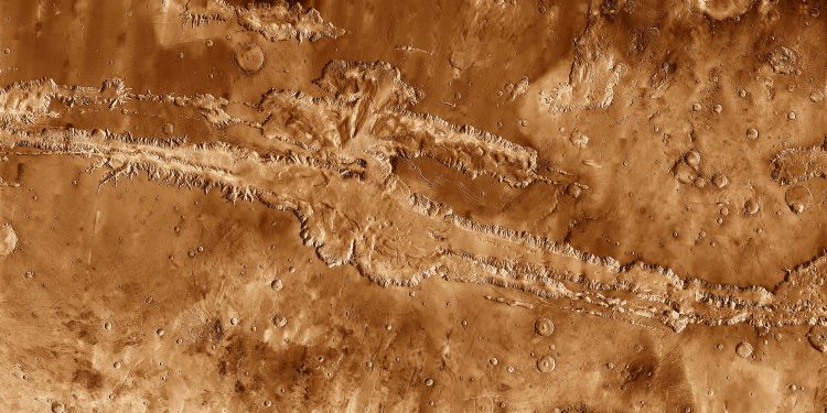 As noted, Valles Marineris is the largest canyon in the solar system, measuring more than 4,000 kilometers (2,485 miles) long, 200 kilometers (124 miles) wide, and 7 kilometers (4.3 miles) deep. For context, its length is equivalent to the United States coast-to-coast, and its depth is more than half the distance of the deepest oceans on Earth. Given Mars' size, Valles Marineris stretches approximately one-quarter of the planet's circumference.