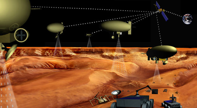 A rover might report that it's seeing smooth rocks in the local vicinity, while the airship or orbiter could confirm that indeed the rover is in a dry riverbed - unlike current missions, which focus only on a global view from far above but can't provide information on a local scale to tell the rover that indeed it is sitting in the middle of dry riverbed.