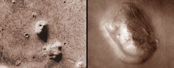 The infamous Mars Face (left) photographed in comparatively low resolution by the Viking orbiter in 1976 and a much higher resolution view made by current Mars Reconnaissance Orbiter. Credit: NASA