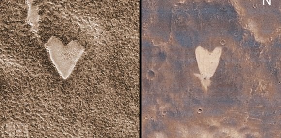 I love these two little hearts. The one on the left is a mesa top outlined by frost about the size of a football stadium. On the right, a small impact crater near the tip of the heart blew away dark surface material exposing lighter soil beneath. Some of the material appears to have flowed downslope to create the heart.