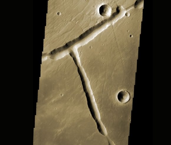 Tectonic stretching of the Martian crust created this unusual right-angle fracture. I wonder how many other letters of the alphabet we might find on the Red Planet?