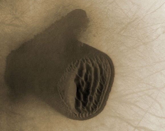 Martians obviously have a sense of humor. This 2-mile-wide (3 km) unnamed crater was photographed in 2008 by the Mars Reconnaissance Orbiter.