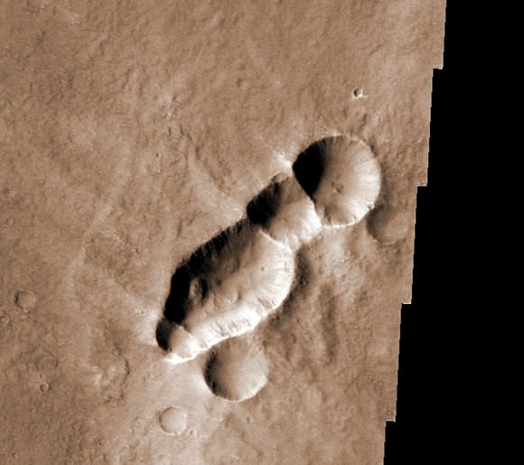 This crater chain with its wispy "wings" of impact debris resembles a wasp. The feature was most likely created when a meteorite arriving it at a very low angle broke into pieces just before impact.