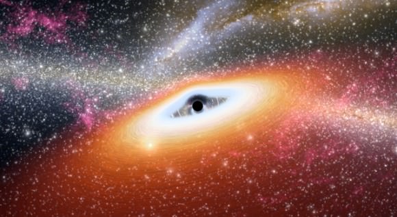 This artist's conception illustrates one of the most primitive supermassive black holes known (central black dot) at the core of a young, star-rich galaxy. Image credit: NASA/JPL-Caltech[/caption]
