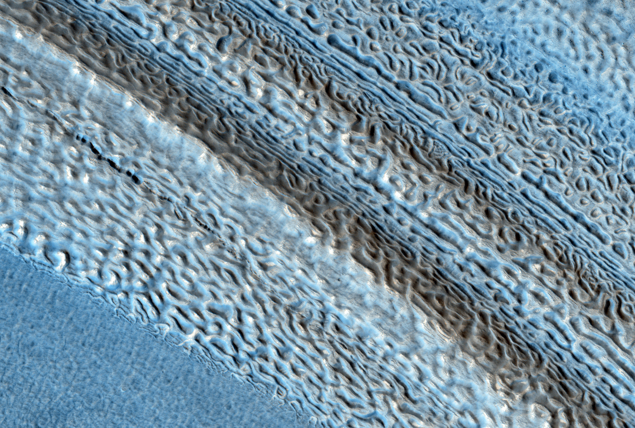 It doesn't take much thought to understand why this landscape on Mars is called "brain terrain" -- the swirling lobes of ice, part of a large glacial deposit in Mars' northern hemisphere, uncannily resemble the texture of a brain -- or at the very least a