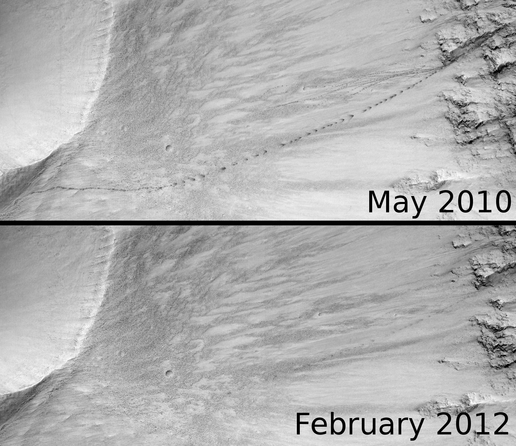 More proof that Mars is an ever-changing world: In 2010, the Mars Reconnaissance Orbiter's HiRISE camera spotted evidence that a boulder had rolled down an incline in a crater. The boulder left a visible track in the Martian regolith big enough to be spotted by MRO. But just one Martian year later, the tracks are gone, erased from existence.