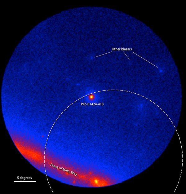Next comes PKS B1424-418, a distant galaxy with a black hole at its center. About 10 billion years ago, this black hole produced a powerful outburst of energy, called a blazar because it's pointed at Earth. The light from this outburst started arriving at Earth in 2012. For a year, the blazar in PKS B1424-418 shone 15-30 times brighter in the gamma spectrum than it did before the burst.