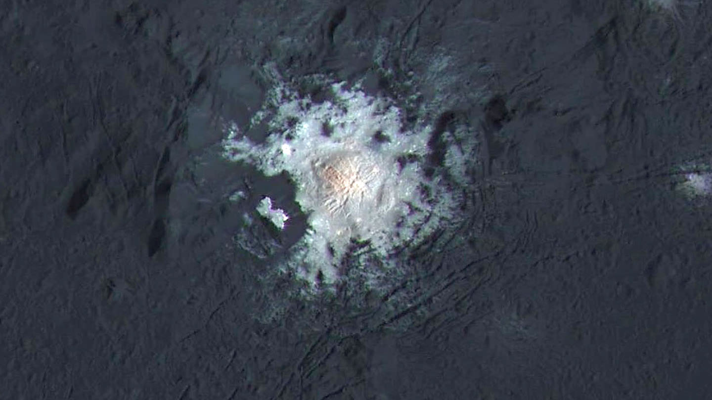 The bright central spots near the center of Occator Crater are shown in enhanced color in this view from NASA's Dawn spacecraft. The view was produced by combining the highest resolution images taken in February 2016 at an image scale of 115 feet (35 meters) per pixel with color images obtained in September 2015 at a lower resolution added. Click for a highest-res view. Credit: NASA/JPL-Caltech/UCLA/MPS/DLR/IDA/PSI[/caption]