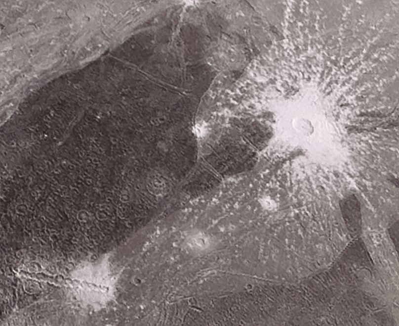 Ganymede's surface has numerous central pit craters, which are complex craters that either have depressions within their floors or central uplifts. While these craters come from impacts, the formation of these central pits -- and why they look the way they do -- is not well understood. But the high content of volatiles such as water ice in the moon's crust likely plays a role.