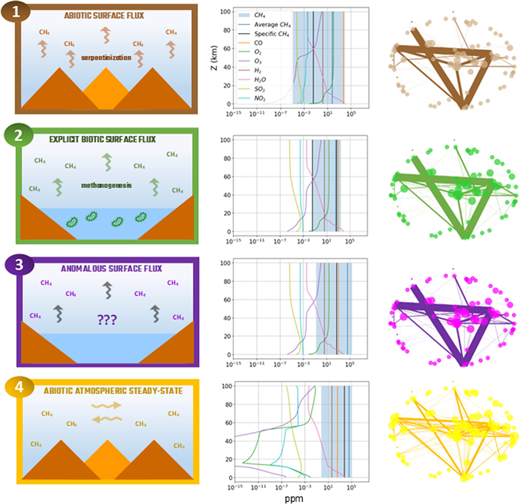 Conceptual representations, abundance profiles, and network visualizations for each category of Archean Earth atmospheric model used in this study. Courtesy Fisher, et al.