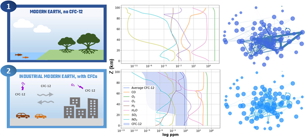 Conceptual representations, abundance profiles, and network visualizations for each category of modern Earth atmospheric model used in this study. The first column shows the scenario, the second column shows the vertical profiles of the atmospheric species abundances corresponding to the initial conditions for each scenario, and the third column shows a network representation of the chemistry in the atmosphere. From top to bottom: (1) Baseline modern Earth model. This model includes no industrial CFC-12 emissions. (2) Modern Earth modeled with emissions of CFC-12. A technosphere is modeled by the addition of a technological source for chloride radicals that can catalyze the destruction of O~3~. Courtesy Fisher, et al.