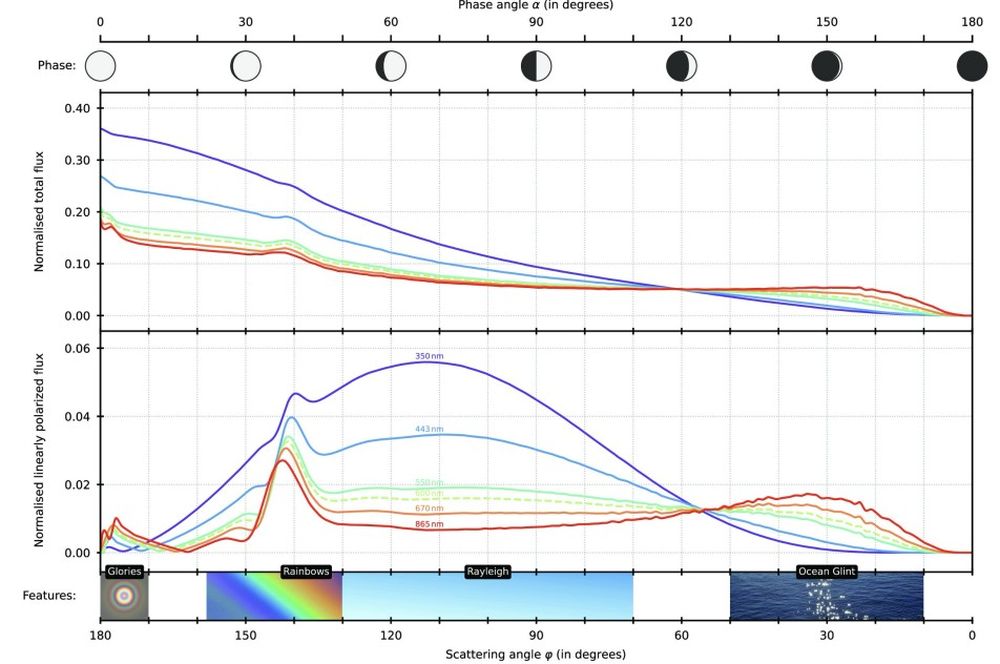 This figure shows planetary reflectivity (top; total flux) and polarization (bottom; polarized flux) as a function of scattering angle (or phase angle) and wavelength (colors). Glories, rainbows, Rayleigh scattering, and ocean glint generate strong polarization signatures and subtle reflectance signatures. The tell-tale shoulder of glint at crescent phases is apparent on the right. Image Credit: Vaughan et al. 2023.